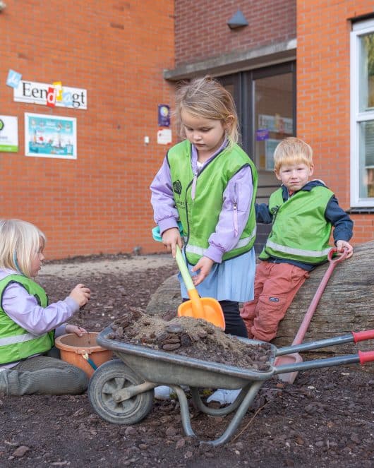 Wij proberen elke dag even buiten te spelen. Er is een hele uitdagende buitenspeelruimte met een boomstam om op te klimmen en een wilgentenen huisje om door te lopen. We hebben ook een glijbaan en een zandbak, en een grote schuur vol met spelmateriaal zoals, fietsen, tractors, emmers, scheppen en ballen! Als het warm is, spelen we met de waterbaan. Vaak zijn de peuters samen met de kleuters van de basisschool op het plein. We spelen samen, leren van elkaar en creëren zo een makkelijkere overgang naar de basisschool.